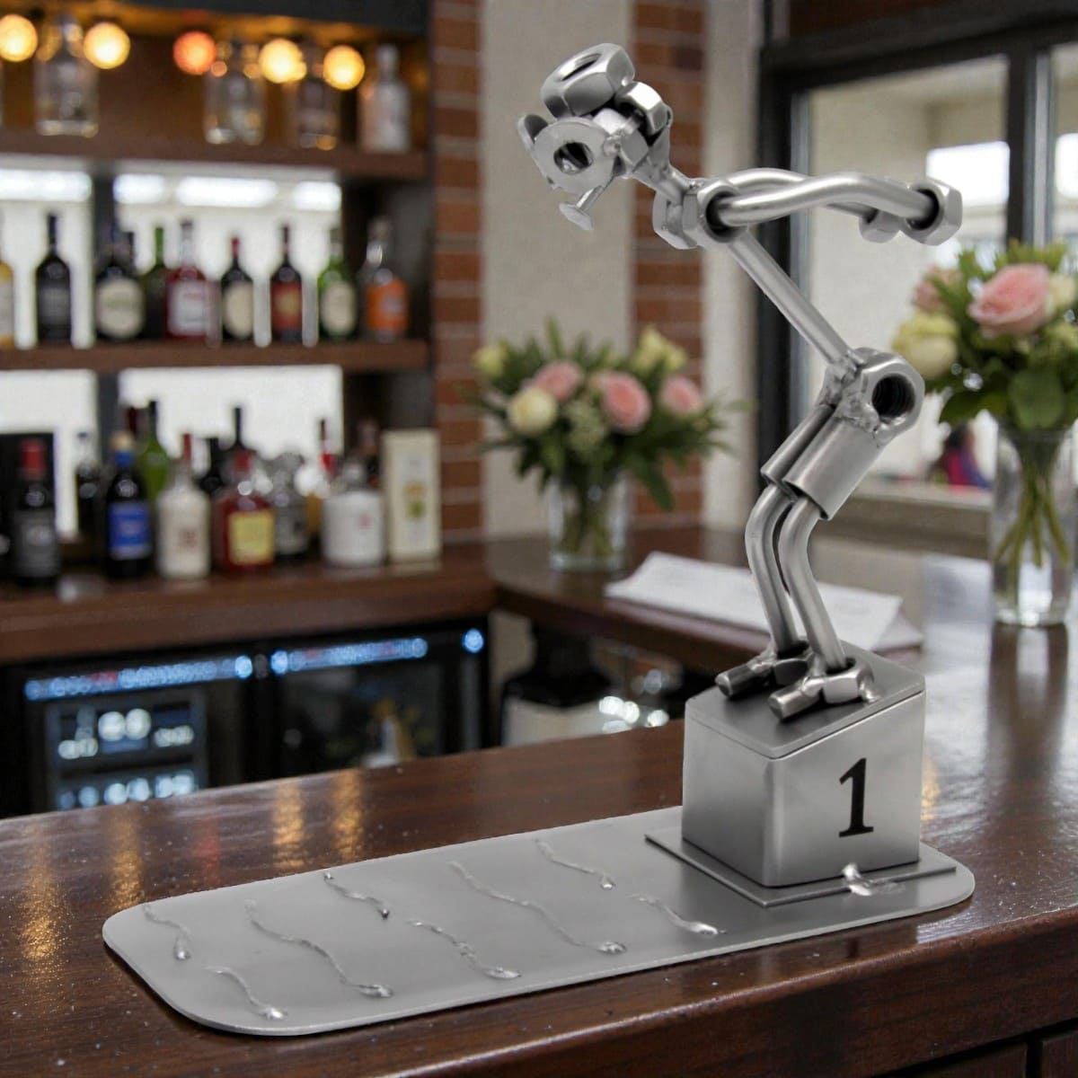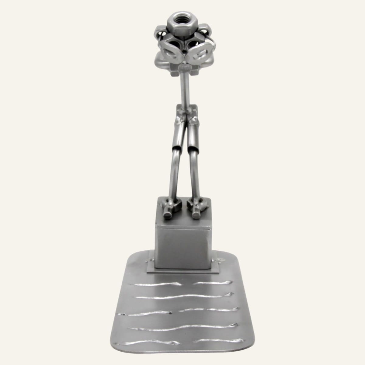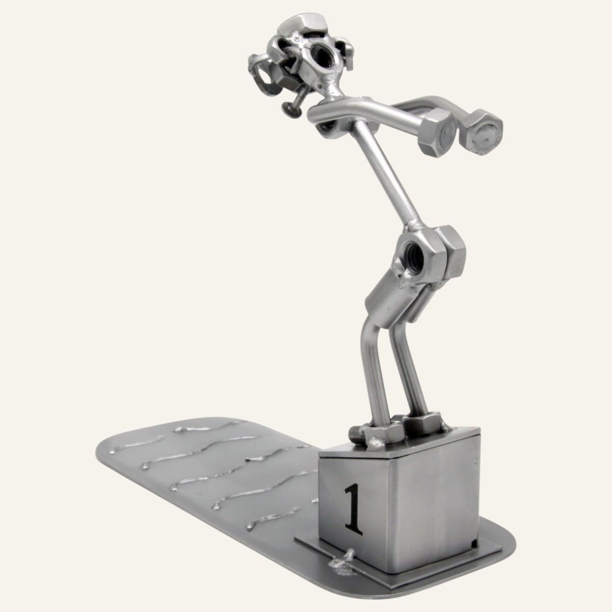 Fabriquée à la main à partir de pièces métalliques tubes, boulons, écrous et vis. Cette statuette capture avec précision et dynamisme la position caractéristique du nageur sur son plot de départ, prêt à s’élancer. Posé sur son socle numéro 1, au-dessus d’une base évoquant la surface de l’eau avec ses ondulations métalliques, ce cadeau nageur est une pièce unique, jamais tout à fait identique à une autre.