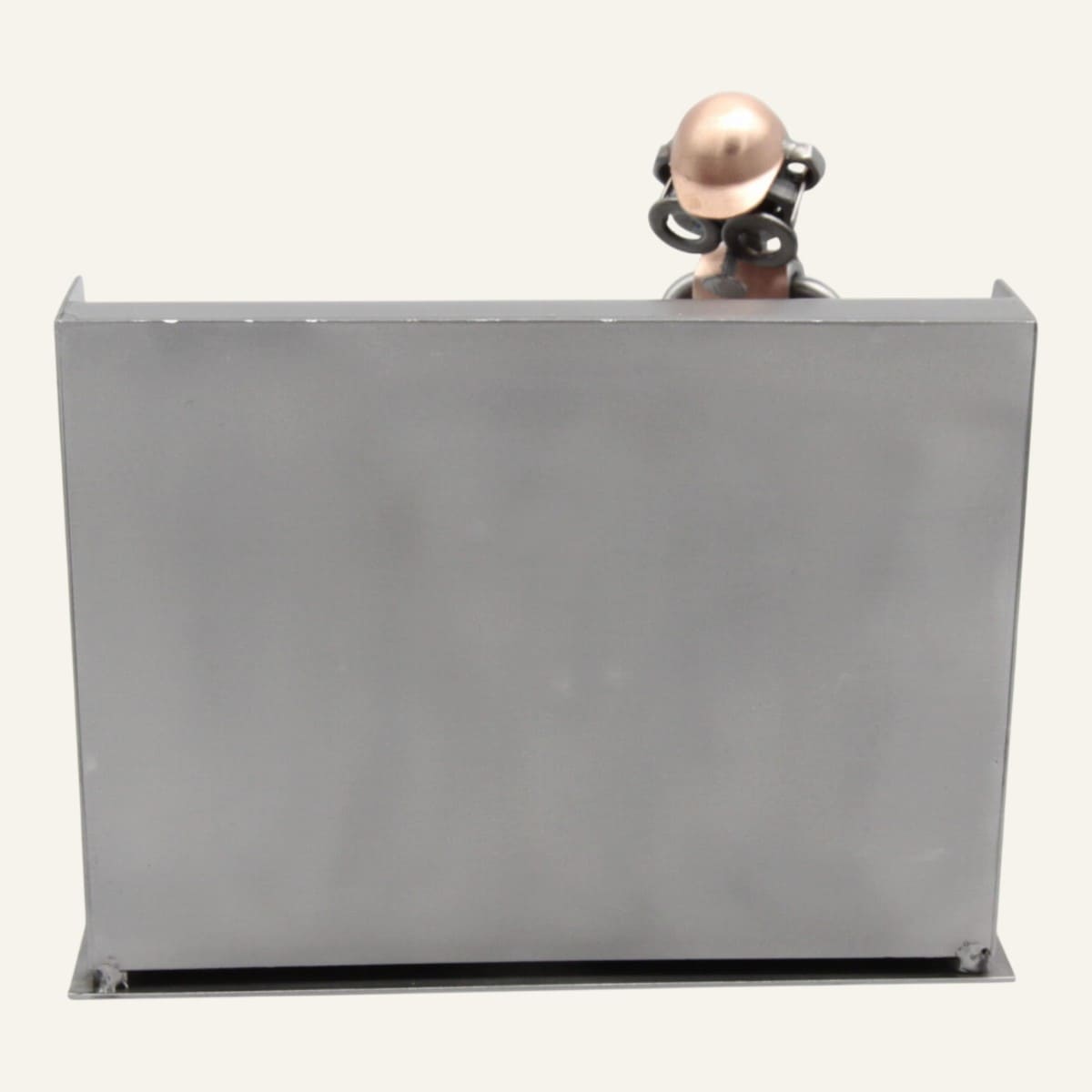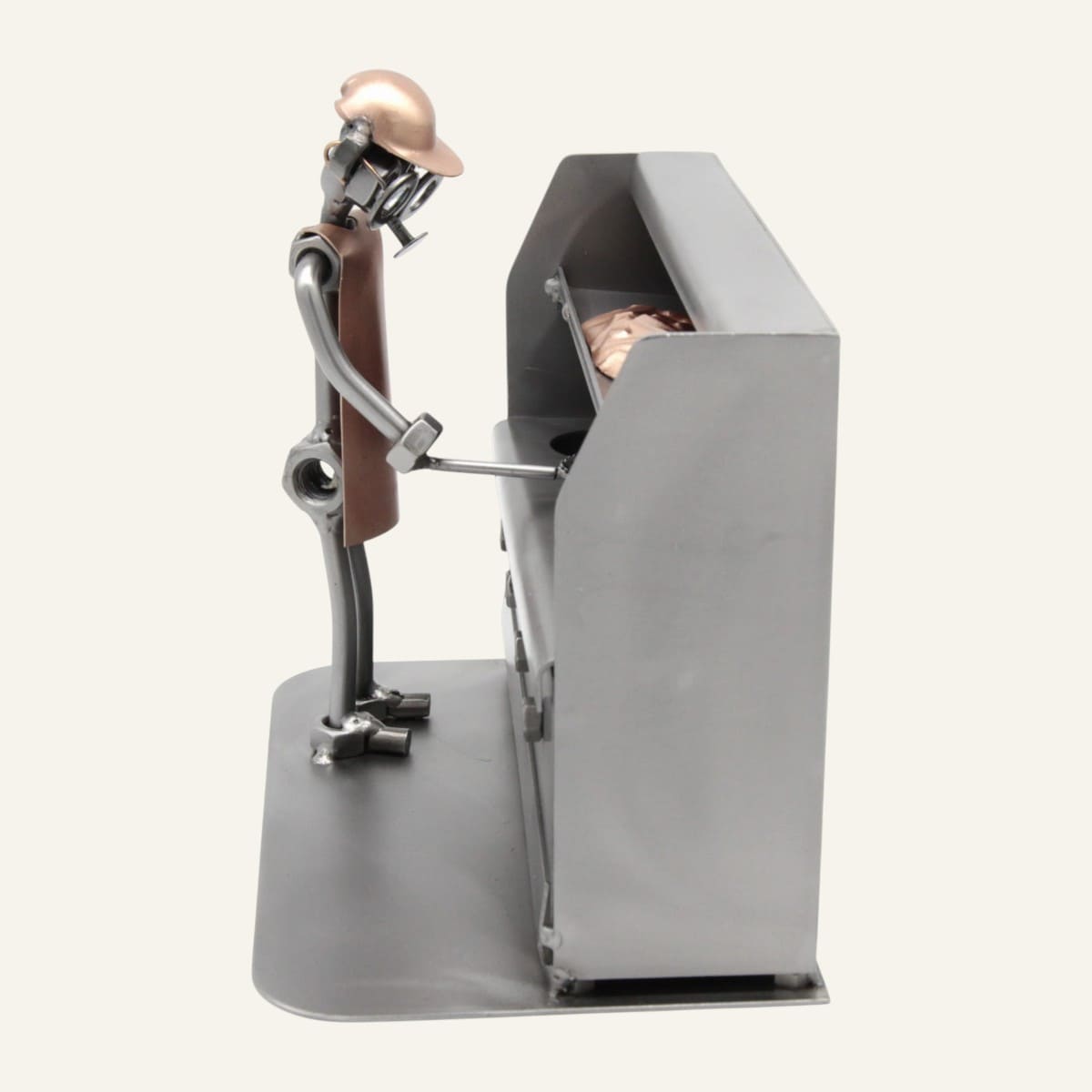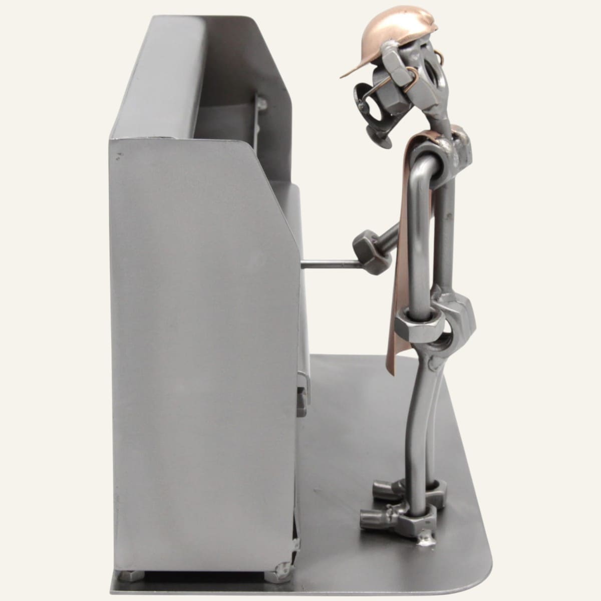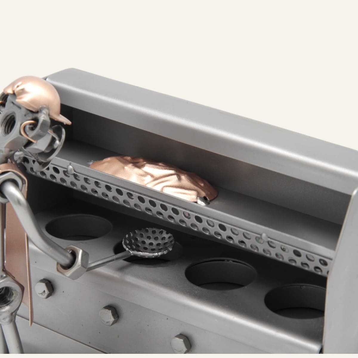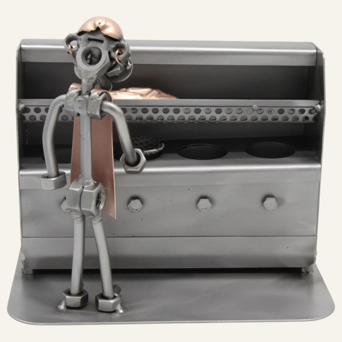 Fabriquée à la main à partir de pièces métalliques recyclées — boulons, vis, écrous — cette statuette représente avec humour et finesse un cuisinier en pleine action devant sa friteuse. Chaque détail est travaillé avec soin, ce qui en fait une pièce unique, jamais tout à fait identique à une autre.